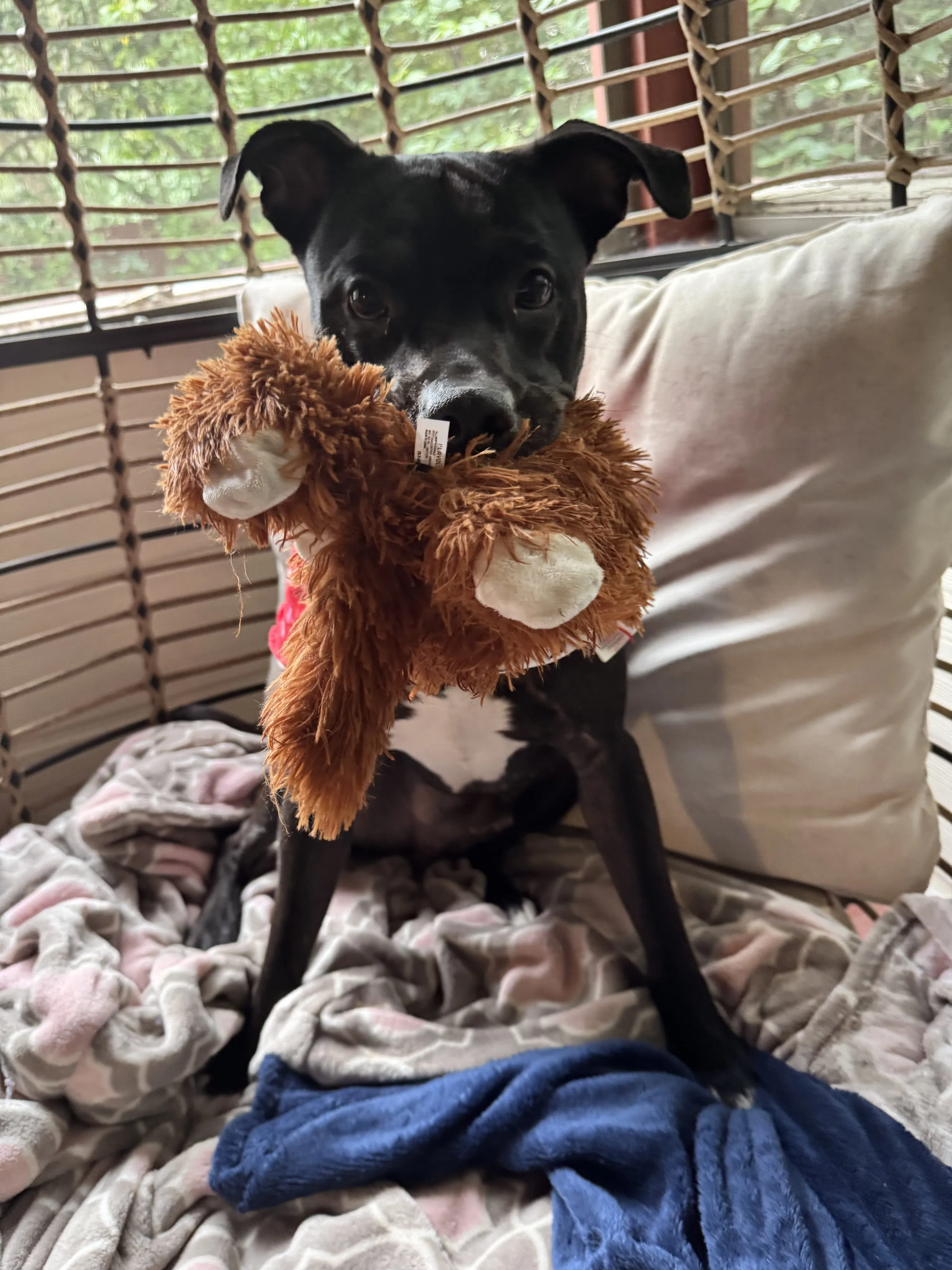 I am a pup who’s just so eager to play that I sometimes forgets my manners. I may pounce a bit hard or get a little overzealous, but it’s all in good fun. There is no malice in my zoomies… just a pure zest for life. Once I get my wiggles out, I can settle in and enjoy the company of my dog friends. I have played successfully with both males and females, but I do best with confident, tolerant dogs who don’t mind my bold playstyle. I might try to tip the scales with a dominant male, so a well-matched buddy (or slow introductions) will help me shine.